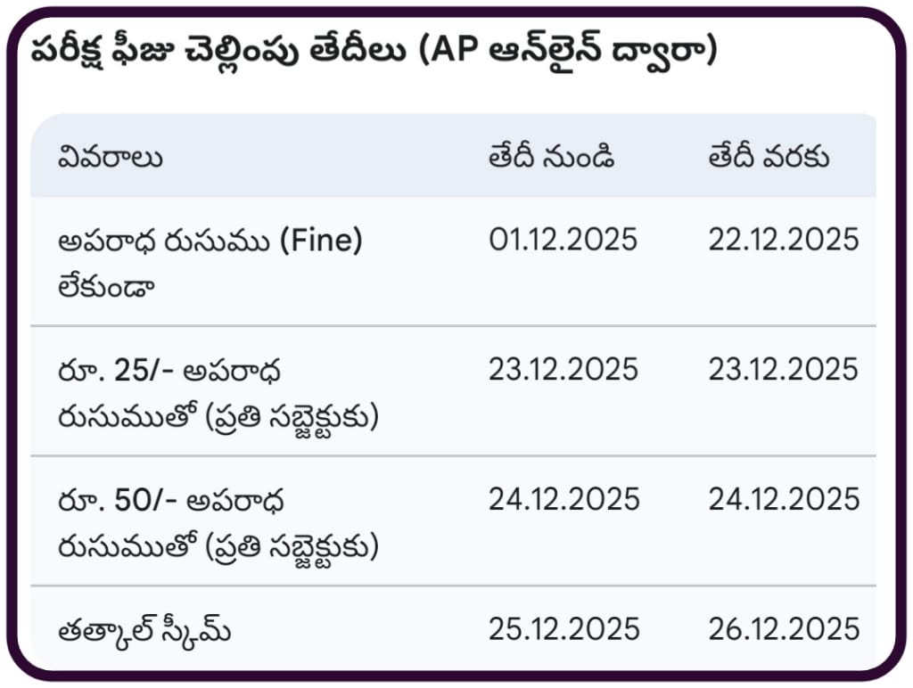 ఆంధ్రప్రదేశ్ ఓపెన్ స్కూల్ సొసైటీ (APOSS) మార్చి-2026లో జరగనున్న SSC మరియు ఇంటర్మీడియట్ పబ్లిక్ పరీక్షలకు సంబంధించిన ఫీజు చెల్లింపు గడువును పొడిగిస్తూ సవరించిన షెడ్యూల్ విడుదల చేసింది