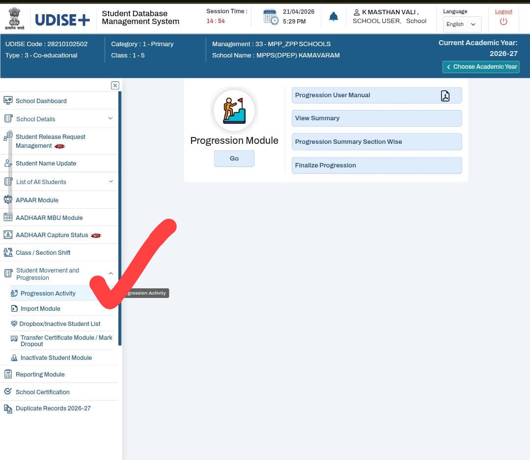# దీనిలో తరగతుల వారిగా, సెక్షన్ ల వారిగా విద్యార్థి ప్రమోట్ అయ్యాడా లేదా, మార్కుల శాతం, మీ పాఠశాలకు 2025-26 లో ఎన్ని రోజులు వచ్చాడు, ప్రస్తుతం అనగా 2026-27 లో మీ పాఠశాలలో ఉన్నాడా లేదా అనే వివరాలు నింపి, 2026-27 సెక్షన్ ను నింపి సబ్మిట్ చేయాలి.