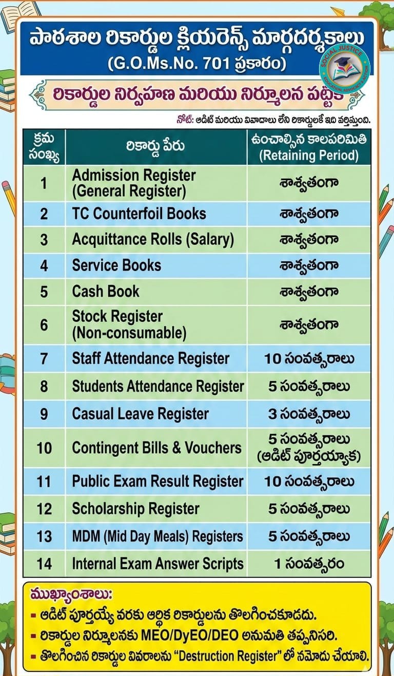 పాఠశాల రికార్డులు మరియు క్లియరెన్స్ మార్గదర్శకాలు, రికార్డుల నిర్వహణ మరియు నిర్మూలన పట్టిక