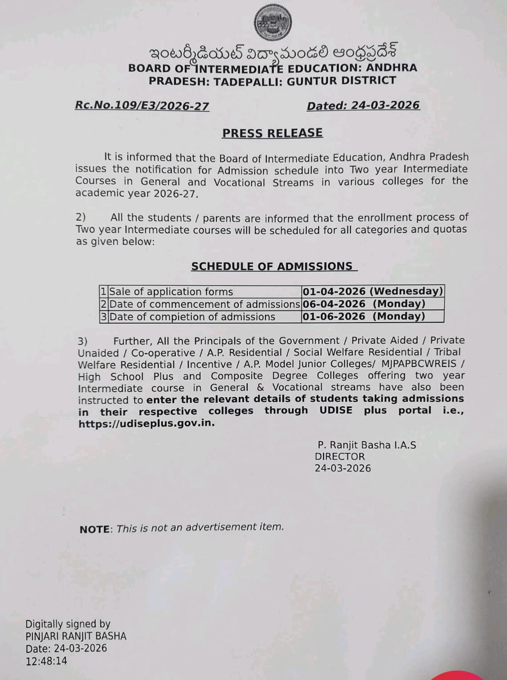 ఏప్రిల్ 1,2026 వ తేదీ నుండి ఇంటర్ మొదటి సంవత్సరం అడ్మిషన్లు ప్రారంభించాలని ఉత్తర్వులు జారీ చేసిన బోర్డు ఆఫ్ ఇంటర్మీడియట్ డైరెక్టర్