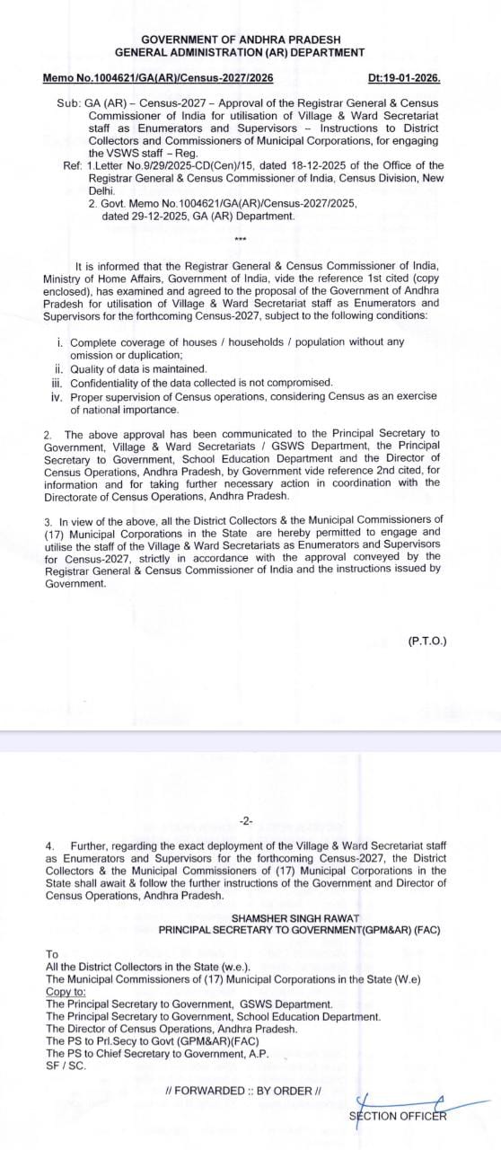 జనగణన–2027 – స్వర్ణ గ్రామ & వార్డు సచివాలయ సిబ్బందిని ఎణుమరేటర్లు మరియు పర్యవేక్షకులుగా వినియోగించుకునేందుకు భారతదేశ రిజిస్ట్రార్ జనరల్ & జనగణన కమిషనర్ ఆమోదం – గ్రామ & వార్డు సచివాలయ సిబ్బందిని నియోగించుటకు జిల్లా కలెక్టర్లు మరియు మున్సిపల్ కార్పొరేషన్ల కమిషనర్లకు జారీ చేసిన సూచనలు.