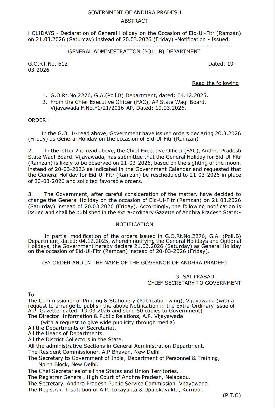 రేపు పనిదినం అనీ, 21 సెలవు అనీ సాధారణ పరిపాలన శాఖ (GAD )జారీ చేసిన జి.వో
