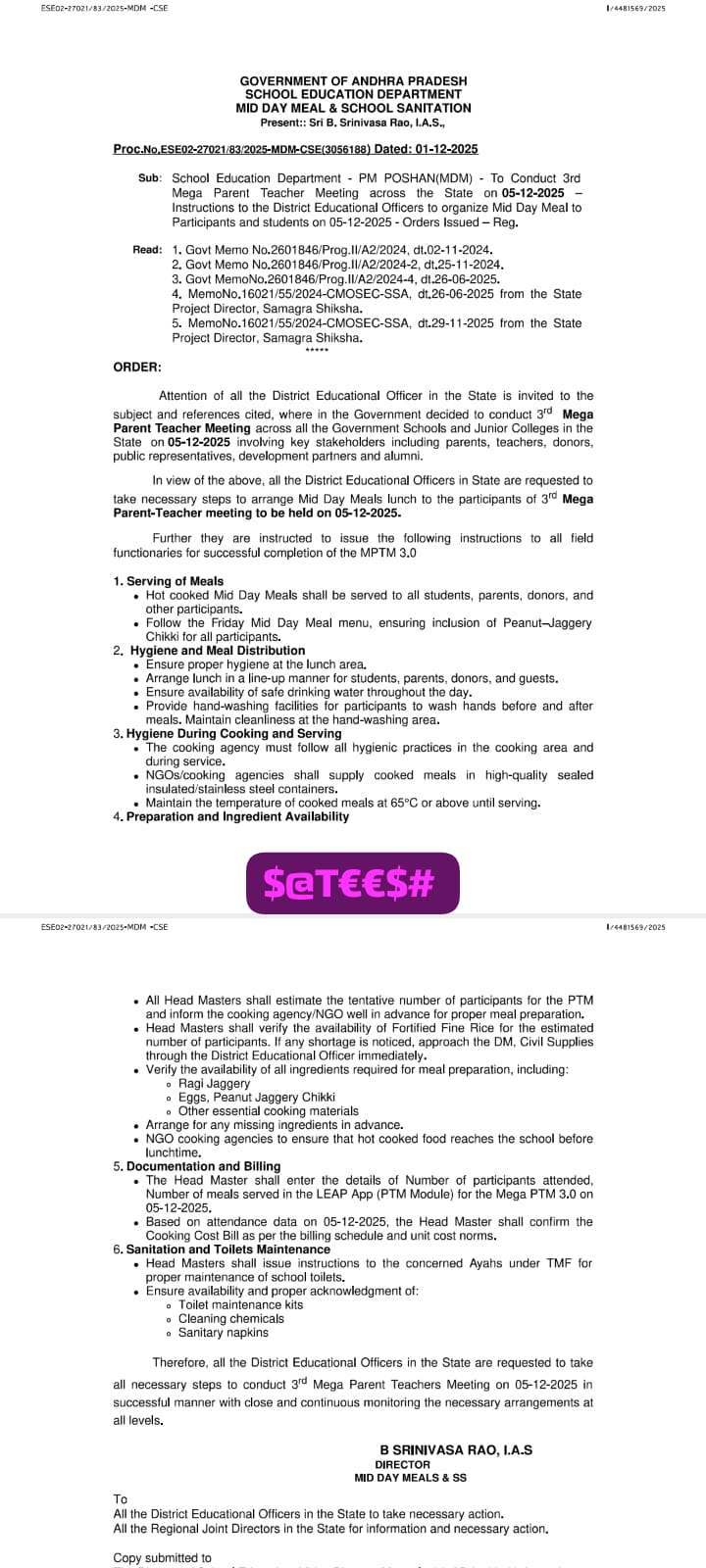 డిసెంబర్ 5, 2025 నాడు మెగా పేరెంట్ టీచర్స్ సమావేశమునకు పాఠశాల సమావేశమునకు సంబంధించి విద్యార్థులకు, మీటింగ్ లో పాల్గొనే వారందరికీ(తల్లిదండ్రులు, SMC సభ్యులు & దాతలు / ఆహ్వానితులు) మధ్యాహ్న భోజనం అందించుటకు సూచనలతో కూడిన తాజా ఉత్తర్వులు జారీ చేసిన ఎం డి ఎం డైరెక్టర్