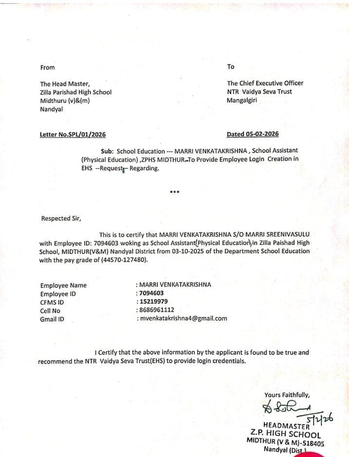 కొత్తగా నియమింప బడిన ఉపాధ్యాయులకు EHS లాగిన్ ఐడి పాస్వర్డ్ లకొరకు మీ యొక్క PAY SLIP, ఆధార్ కార్డు మరియు REQUEST LETTER, NTR TRUST కు మెయిల్ పంపించాలి..