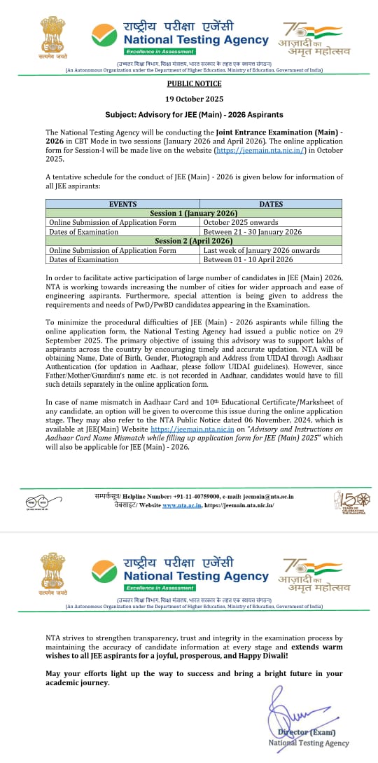 జేఈఈ మెయిన్-2026 పరీక్షల షెడ్యూల్ విడుదల JEE-MAIN-2026 TENTATIVE SCHEDULE