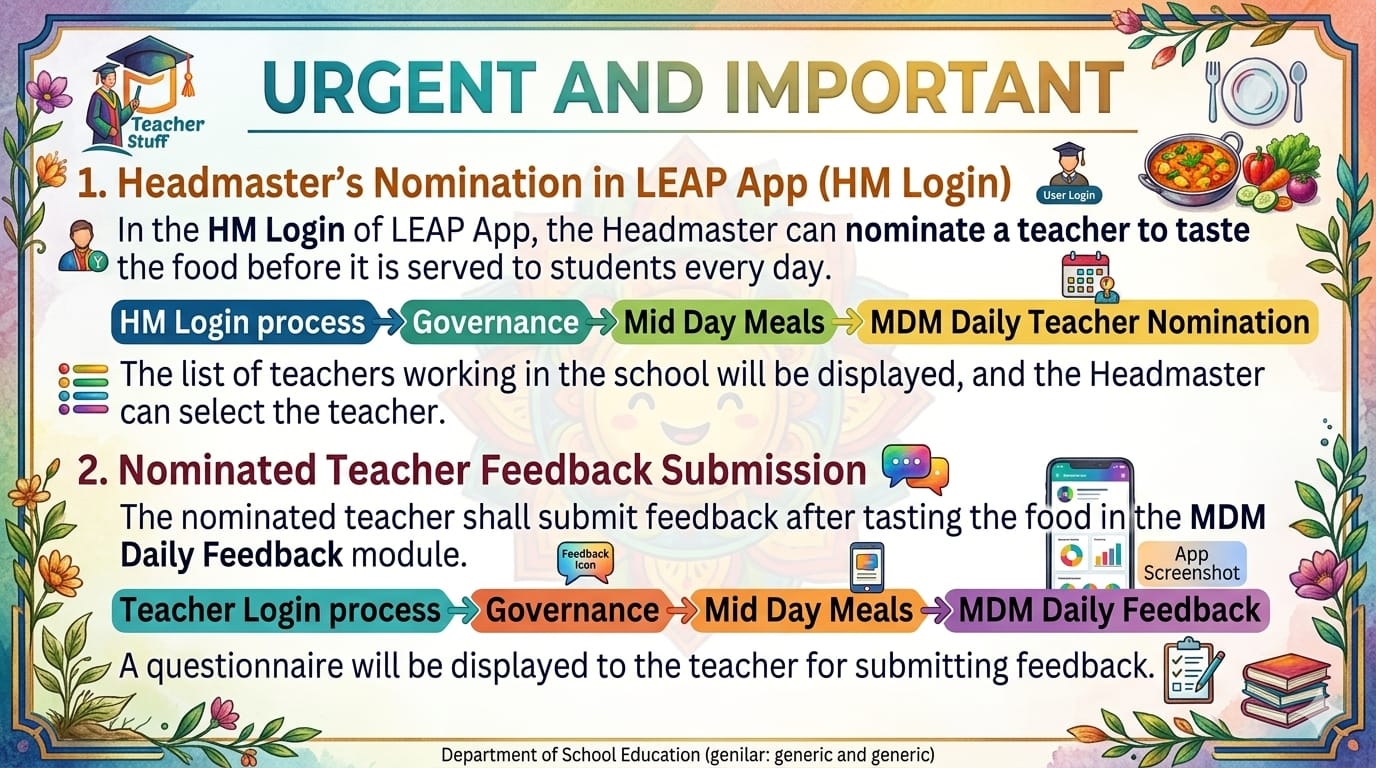 అందరు మండల విద్యా అధికారులు (MEOs) మరియు ప్రధానోపాధ్యాయులు (HMs) - ప్రతిరోజూ LEAP యాప్ ద్వారా మధ్యాహ్న భోజన పథకం (MDM)ను పర్యవేక్షించవలసిందిగా ఆదేశించబడుచున్నారు.