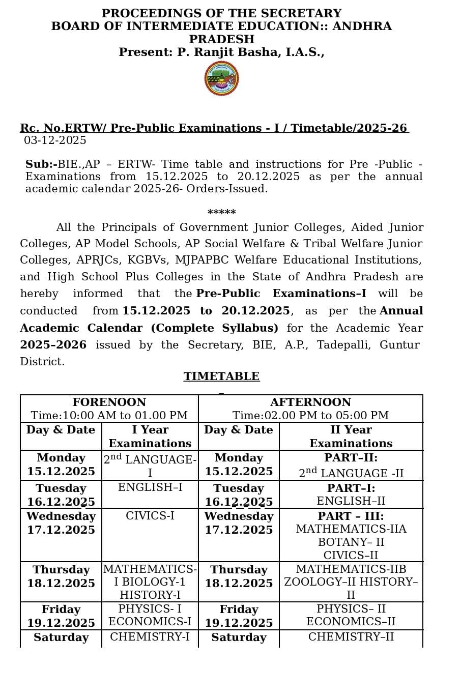 AP Intermediate PRE-PUBLIC DECEMBER-2025 Examination Time-Table