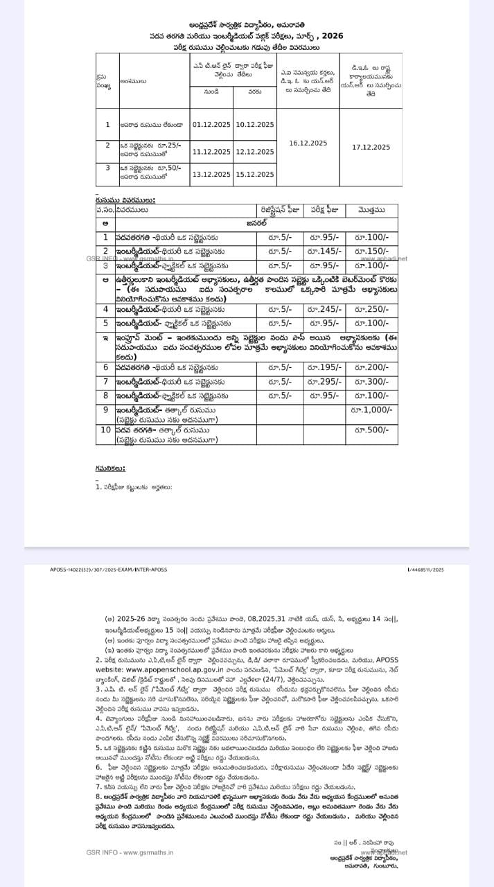 ఆంధ్రప్రదేశ్ సార్వత్రిక విద్యా పీఠం, అమరావతి ద్వారా నిర్వహించబడే పదవ తరగతి మరియు ఇంటర్మీడియట్ పబ్లిక్ పరీక్షల (మార్చి 2026) కొరకు పరీక్ష ఫీజు చెల్లించడానికి చివరి తేదీలు డిసెంబర్ 1, 2025 నుండి డిసెంబర్ 15, 2025 వరకు ఉన్నాయి. విద్యార్థులు ఈ గడువులోపు ఏదైనా APONLINE సేవా కేంద్రం లేదా ఆన్లైన్ పేమెంట్ గేట్వే ద్వారా నేరుగా ఫీజు చెల్లించవచ్చు.