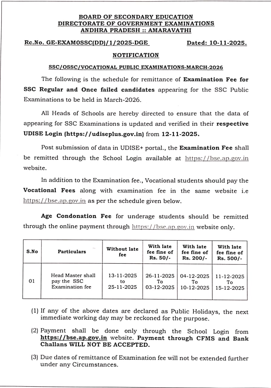 పరీక్ష రుసుము చెల్లించే ముందు అన్ని ప్రధానోపాధ్యాయులు 12-11-2025 నుండి UDISE+ పోర్టల్ అంటే https://udiseplus.gov.in లో విద్యార్థుల డేటాను నవీకరించి, ధృవీకరించారని నిర్ధారించుకోవాలి.