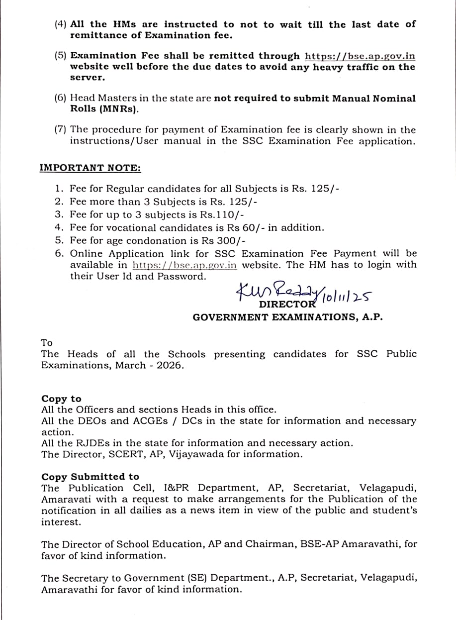 AP SSC PUBLIC EXAMINATIONS 2025-26 REGULAR / OSSC / VOCATIONAL FEE PARTICULARS , DUE DATES ,LATE FEE RC.NO GE-EXAMOSSC(DD)/1/2025-DGE