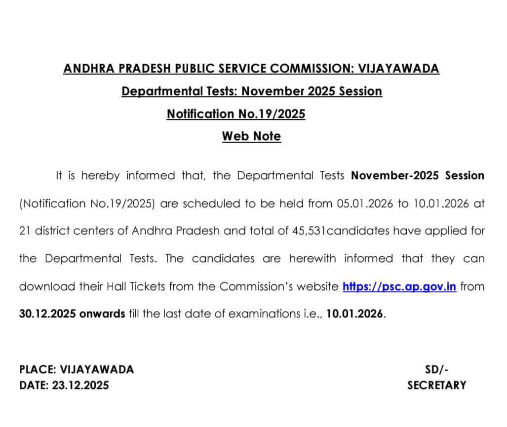 Departmental Tests Hall Tickets: November 2025 Session Notification No.19/2025