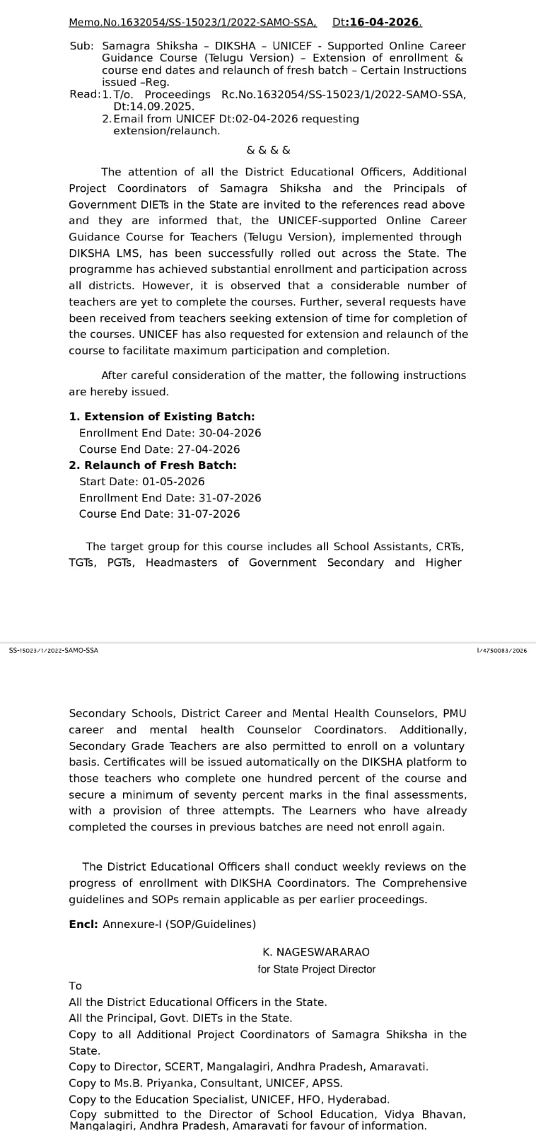 Dear AMOs and DIKSHA Cordinators, please note, Enrolment and Course end dates of UNICEF supported career guidance online courses on DIKSHA are extended to 30-04-2026. Further, those who are not able to successful in present batch are requested to join in the fresh batch scheduled from 01-05-2026. Please share this information with all the MEOs, Headmasters and Teachers please. - DIKSHA, Andhra Pradesh.