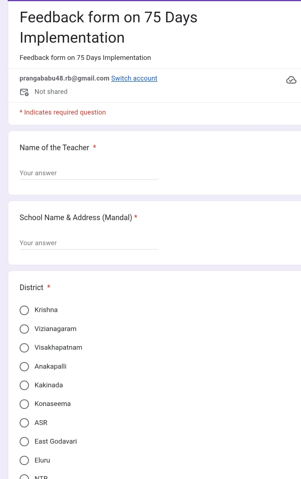 Guaranteed FLN కార్యక్రమంలో భాగంగా అమలు చేస్తున్న 75 రోజుల Action Plan పాఠశాలల్లో ఎలా అమలవుతున్నదీ తెలుసుకోవడానికి ఈ Google Form రూపొందించబడింది. మీ తరగతిలో జరుగుతున్న ఈ యాక్షన్ ప్లాన్ యొక్క నిర్వహణ పై మీ అభిప్రాయాన్ని తెలుసు కోవడం ద్వారా, ఈ కార్యక్రమాన్ని మరింత ప్రభావవంతంగా చేయడానికి ఈ సమాచారం ఉపయోగపడుతుంది.