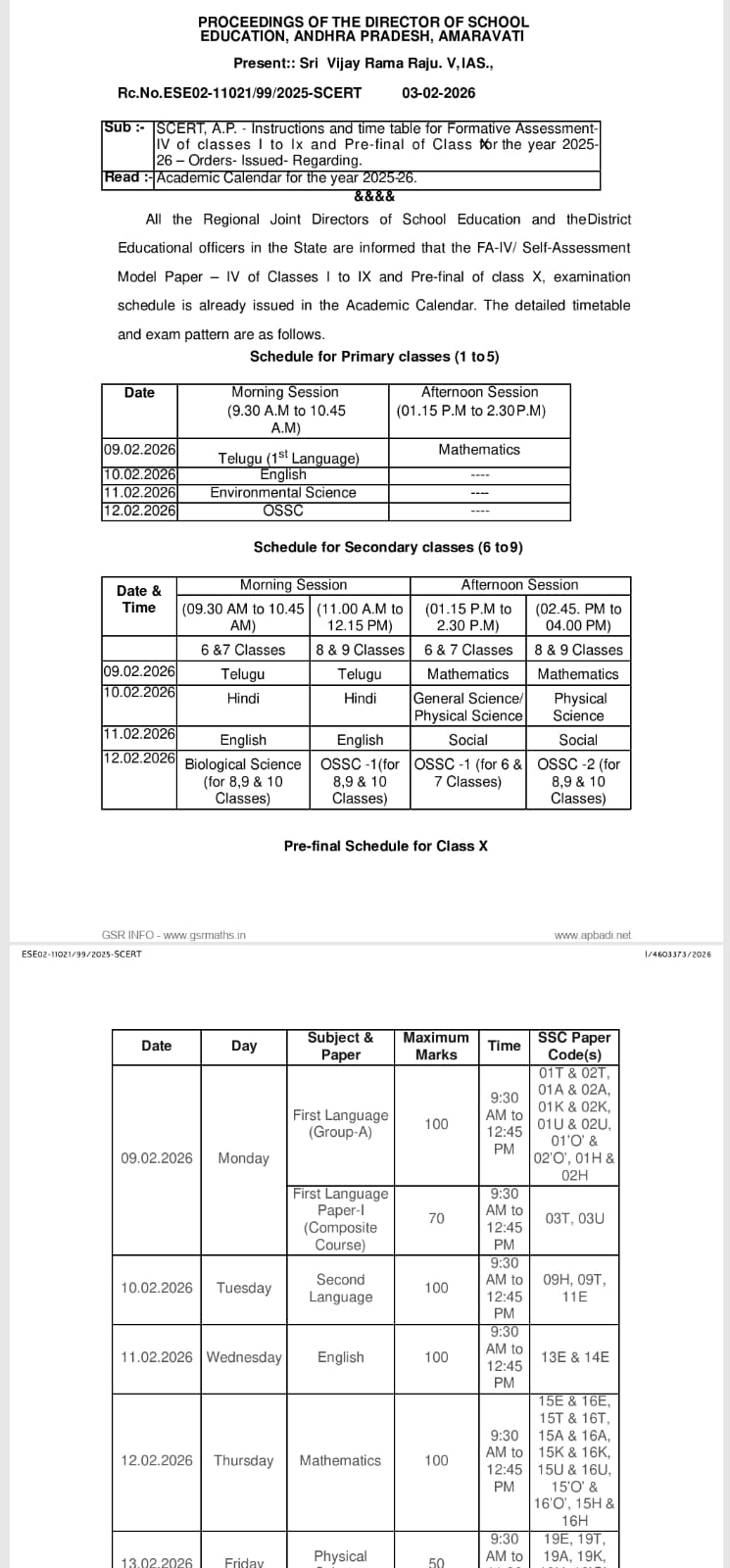 2. Similarly, Class X pre final examinations are scheduled from 09.02.2026 to 19.02.2026.