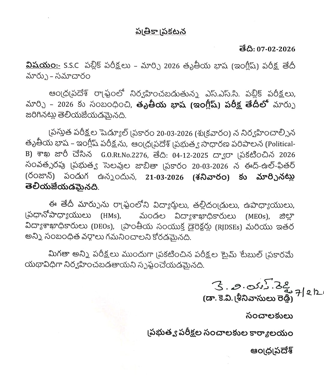 టెన్త్ పబ్లిక్ పరీక్షల తేదీల్లో స్వల్ప మార్పు జరిగింది. ఇంగ్లిష్ పరీక్షను మార్చి 20న కాకుండా 21న (శనివారం) నిర్వహించనున్నట్లు ఎస్సెస్సీ బోర్డు అధికారికంగా ప్రకటించింది. 20న రంజాన్ ఉండటంతో ఈ నిర్ణయం తీసుకున్నామని పేర్కొంది. మిగతా అన్ని పరీక్షలు ముందుగా ప్రకటించిన టైమ్ టేబుల్ ప్రకారమే యథావిధిగా జరుగుతాయని స్పష్టం చేసింది. కాగా మార్చి 16 నుంచి ఏప్రిల్ 1 వరకు టెన్త్ పరీక్షలు జరగనున్నాయి.