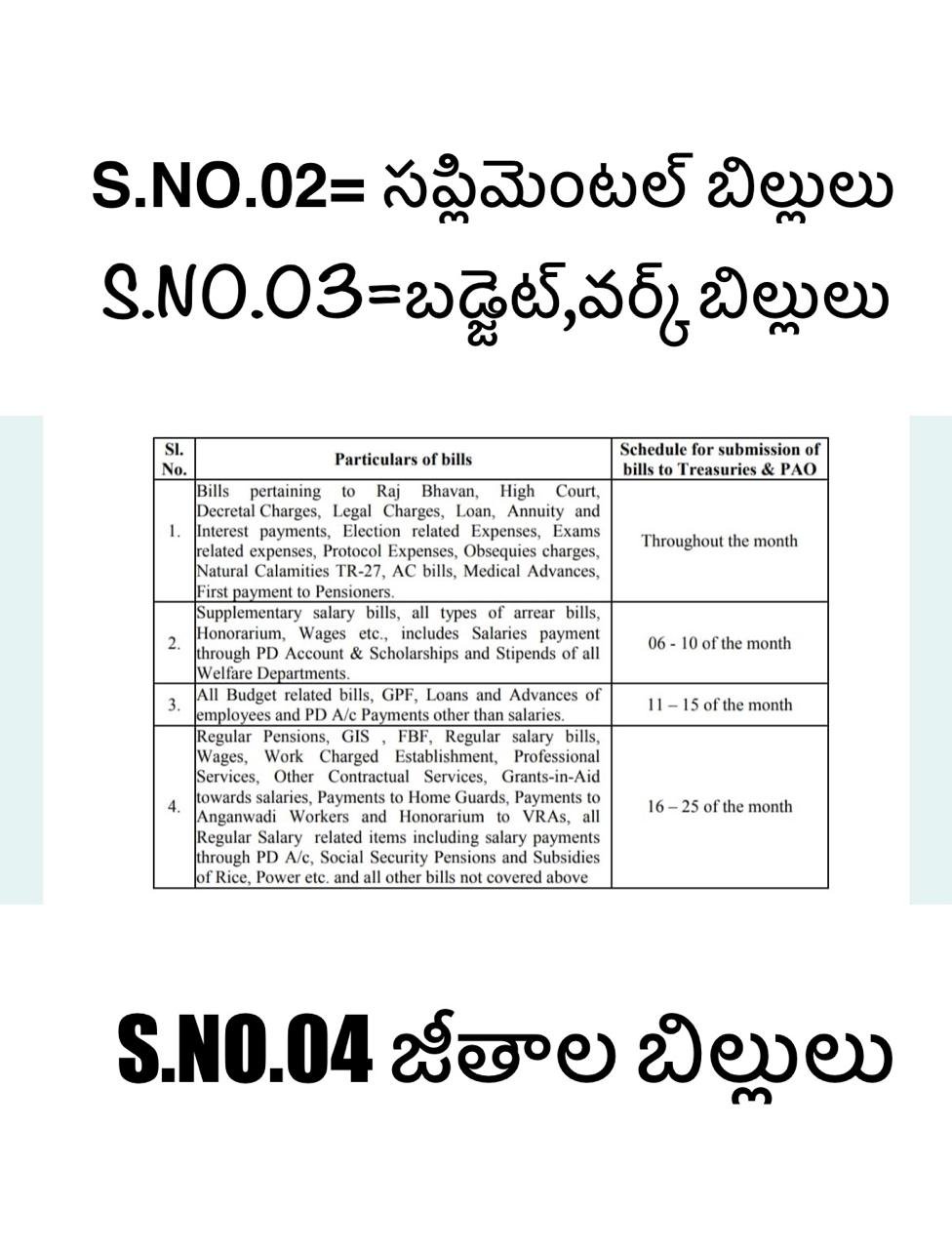 Supplementary bills 10 వ తేదీ తరువాత,రెగ్యులర్ salary bills 25 వ తేదీ తరువాత ఫైనల్ thumb submission సదుపాయము నిలిపివేయబడినది.కావున బిల్లు ప్రాసెస్ మొత్తము పై తెల్పిన నిర్ణీత తేదీ లలో పూర్తి చేయవలెను.