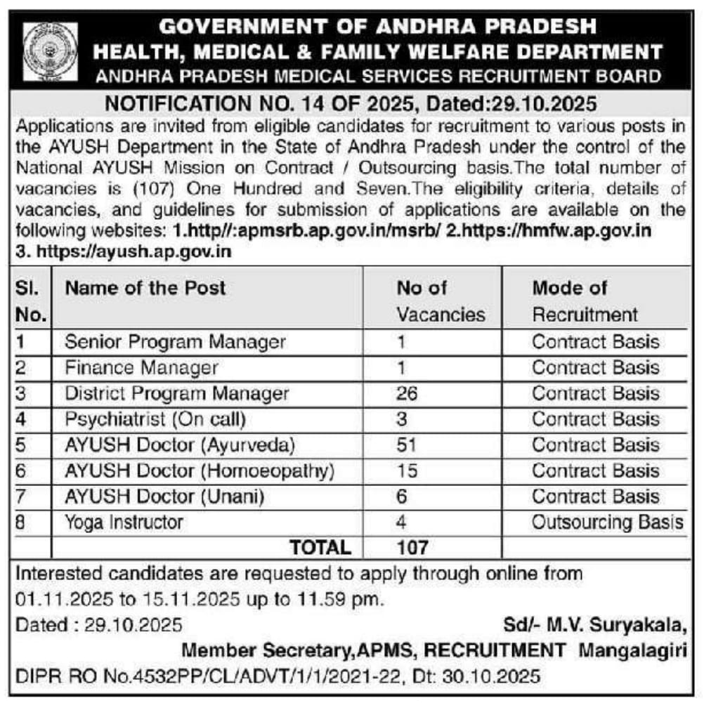 ఆంధ్రప్రదేశ్ రాష్ట్రంలోని ఆయుష్ విభాగంలో వివిధ పోస్టులకు కాంట్రాక్ట్/అవుట్సోర్సింగ్ పద్ధతిలో దరఖాస్తులు ఆహ్వానించబడుతున్నాయి.